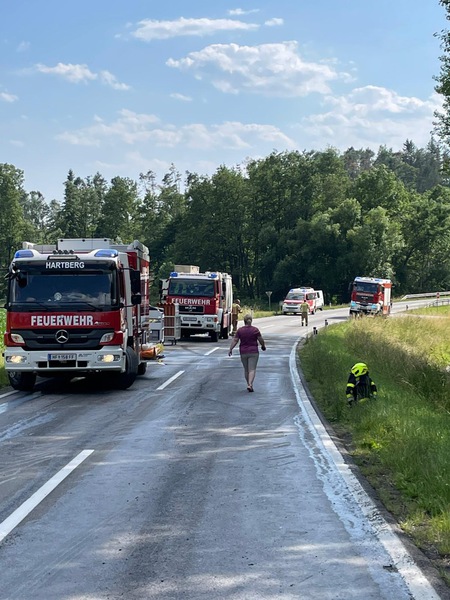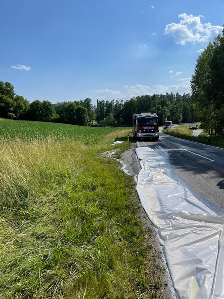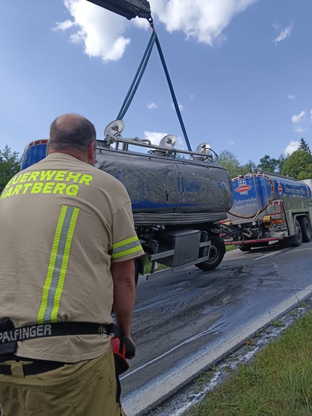 Situation beim Eintreffen: Auf der L406 kam der Anhänger eines Milchtransporters ins Schleudern. Dadurch kippte der Anhänger um und Milch trat aus. Das SRF Hartberg stellte den Anhänger mittels Kran wieder auf.